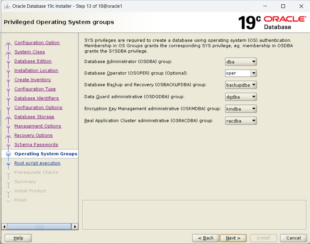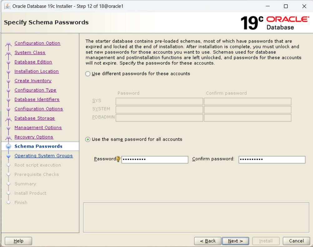 [root@oracle1 ~]# dnf localinstall oracle-database-preinstall-19c-1.0-1.el9.x86_64.rpm [root@oracle1 ~]# passwd oracle Changing password for user oracle. New password: Retype new password: passwd: all authentication tokens updated successfully. [root@oracle1 ~]# reboot