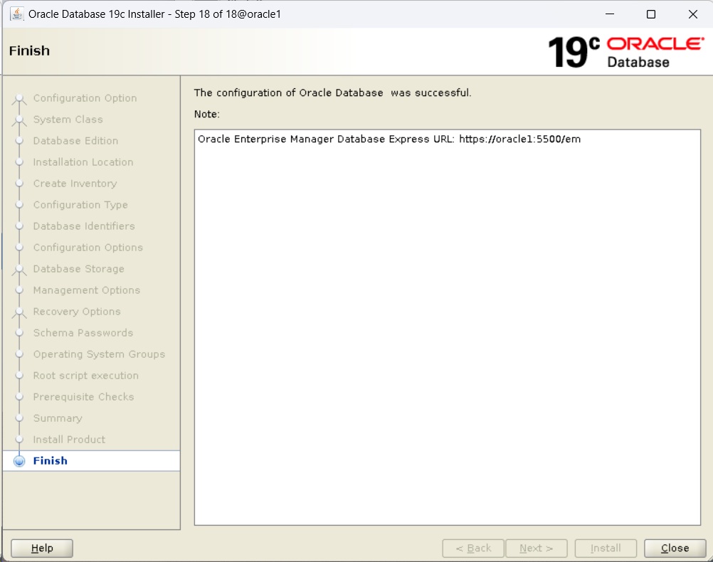 [root@oracle1 ~]# dnf localinstall oracle-database-ee-19c-1.0-1.x86_64.rpm Last metadata expiration check: 0:02:06 ago on Fri 11 Jul 2025 05:00:59 PM KST. Dependencies resolved. ========================================================================================================================================================== Package Architecture Version Repository Size ========================================================================================================================================================== Installing: oracle-database-ee-19c x86_64 1.0-1 @commandline 2.5 G Transaction Summary ========================================================================================================================================================== Install 1 Package Total size: 2.5 G Installed size: 6.9 G Is this ok [y/N]: y Downloading Packages: Running transaction check Transaction check succeeded. Running transaction test Transaction test succeeded. Running transaction Preparing : 1/1 Running scriptlet: oracle-database-ee-19c-1.0-1.x86_64 1/1 Installing : oracle-database-ee-19c-1.0-1.x86_64 1/1 Running scriptlet: oracle-database-ee-19c-1.0-1.x86_64 1/1 [INFO] Executing post installation scripts... [INFO] Oracle home installed successfully and ready to be configured. To configure a sample Oracle Database you can execute the following service configuration script as root: /etc/init.d/oracledb_ORCLCDB-19c configure Verifying : oracle-database-ee-19c-1.0-1.x86_64 1/1 Installed: oracle-database-ee-19c-1.0-1.x86_64 Complete! [root@oracle1 ~]#