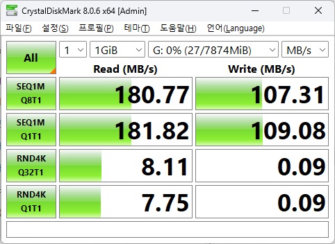 | V03S SLC 3.0 | O | 8GB | 180 MB/s | 110 MB/s | 103 MB/s | 10,000 | 재생NAND 의심 | ||||