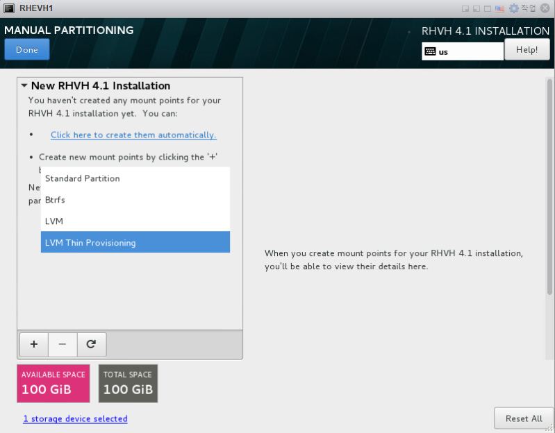 - You must select the LVM Thin Provisioning option in the Manual Partitioning window.